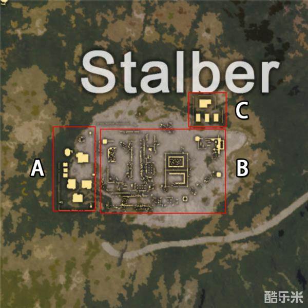山顶一共分为三块区域,A区域是资源相对击中也是山顶中最肥的点,特别是A区域中的卫星楼。B区域就是大片的废墟了,里面资源分布的比较散,不过里面也有不少的好东西。C区域就是右上角的四栋房子了,一般也是最穷的地方,可能四栋房子搜完出来只有一把手枪。