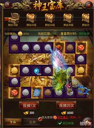 打开菜单下方的神王宝库,神王宝库里是弯曲蜿蜒的迷宫,每一步都能有收获,但是前进都需要一定的特殊道具“神王魔方”才可以。当然了,玩家们也可以使用元宝进行购买,不管是走一步还是一次性走二十步都可以,有钱就是这么任性!每走一段距离,则可以解锁下一层神王宝库,越到后方,需要的元宝数量也就越多。不过别着急,每天上线都会免费赠送5次前进的神王魔方!大家上线可千万别忘了前往神王魔方闯荡一番。而当玩家到达固定的层数如第3层、第6层、第10层等时,就可以解锁宝箱了!