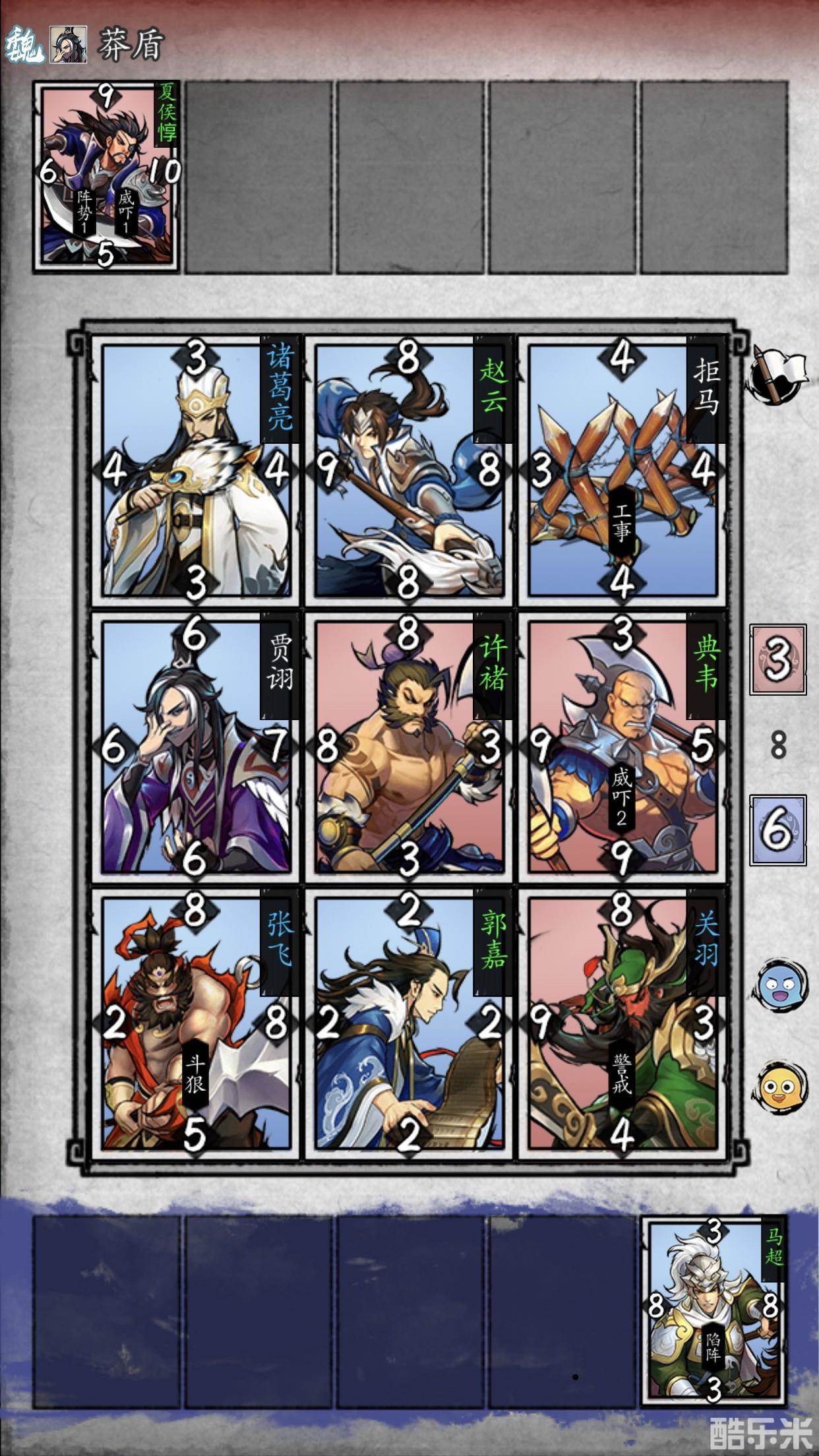对于行事谨慎、稳中求进的玩家朋友们来说,主打增益己方、削减敌方点数,并且拥有封禁敌人技能的魏国,无疑是最为理想的选择:张辽、夏侯惇的“阵势”技能,“进场置于相邻的友军点数+1”,使得我方武将在比较点数时,往往占据上风;典韦的“威吓”能令“进场置于相邻的敌军点数-2”,甚至还有武将能让对方攻击无效;而于禁的“禁言”以及司马懿的“定论”,则是直接“抹杀”敌人技能,这对于技能型武将来说,近乎是致命的。