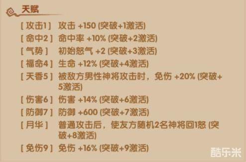 5.天香5:被敌方男性神将攻击时,免伤+20%(突破+5激活)