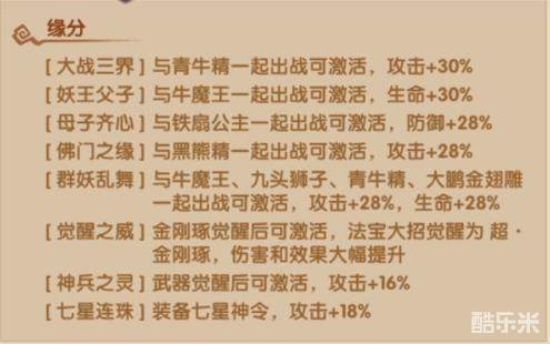 群妖乱舞:与牛魔王、九头狮子、青牛精、大鹏金翅雕一起出战可激活,攻击+28%、生命+28%