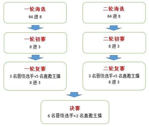 复赛:初赛晋级的3名选手与5名直邀主播混合分为两组,各进行为期两天;当天进行三场排名积分比赛,积分前3名晋级。