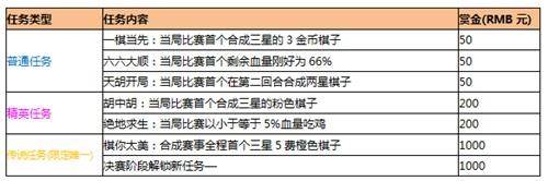 选手在初赛中完成了赛事全程首个合成三星的橙色棋子传说任务,则后续其他选手达成条件也无法再次获得该赏金奖励。