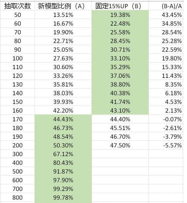 另外,抽取次数达到170抽以上,则新模型优于固定15%up的模型;新模型对约56%的人(大部分人)更为友好。
