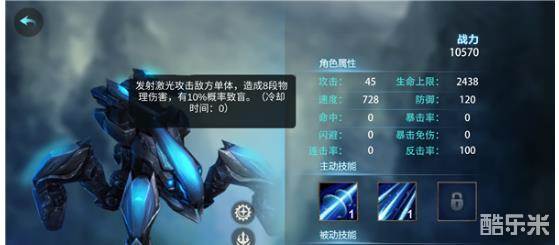 光能炮击:发射激光攻击敌方单体,造成8段物理伤害,有10%概率致盲。