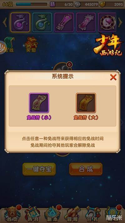 在进行【抢夺】玩法时,被抢夺的一方面临着失去宝物碎片的风险。此时若开启【免战】功能,即可避免宝物碎片被他人抢夺。小免战符可免战2小时,大免战符可免战8小时,值得注意的是,免战期间,如果主动抢夺其他玩家将会解除免战状态。少年们当获得橙色宝物碎片时,不妨适当开启免战功能哦!