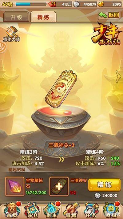 当获得多个相同的宝物时,可以通过【宝物精炼】提升精炼品阶。经过精炼后的宝物能够大幅提升攻击和攻击加成增益。