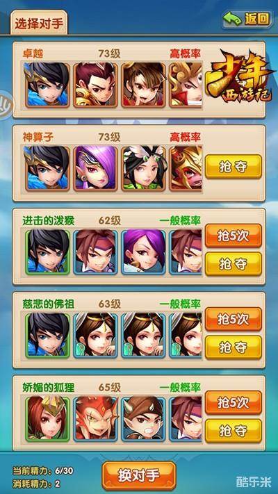 在《少年西游记》中,少年们想要更多更强宝物的话,就要通过【冒险】界面中的抢夺玩法获取宝物碎片和经验宝物碎片。点击缺失的碎片后将出现【选择对手】的界面,此时即可消耗2点精力,选择抢夺的对象进行PK。一般来说,战胜越强大的对手,获得碎片的概率也越高。