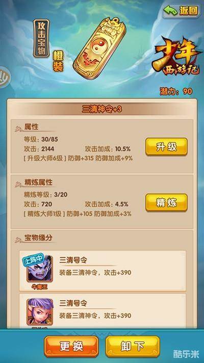 在《少年西游记》的【阵容】界面中可以看到,神将们除了装备有一身华丽的武器防具外,还有两个宝物栏分别可装备攻击和防御宝物。与装备一样,宝物的品质分蓝色、紫色、橙色等档次,目前最优秀的宝物为橙色品质。