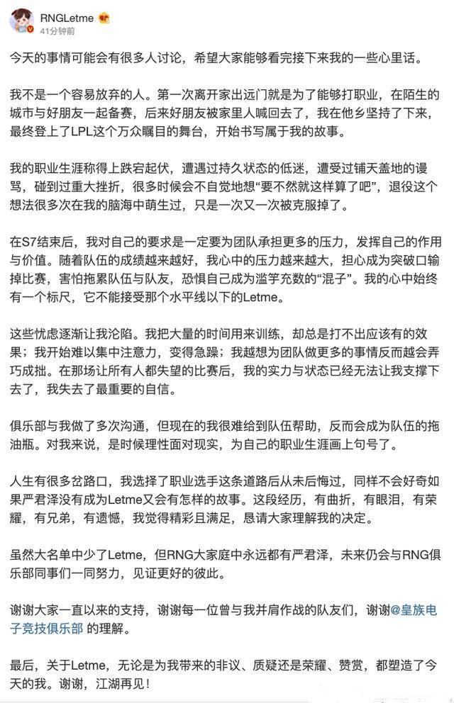 在皇族宣布letme退役后,他本人也是发表了一份很长的退役声明: