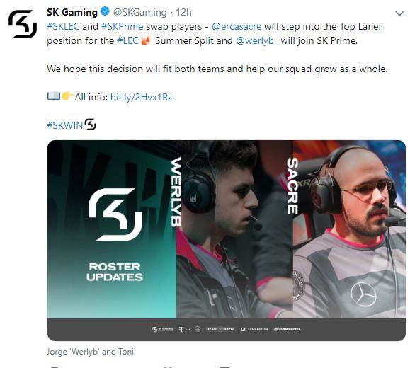 英雄联盟LEC战队SK官宣:与自家青训队互换上单
