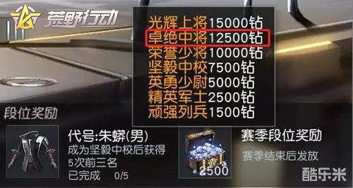 赛季S6将在荣耀少将与光辉上将之间增加全新段位——卓绝中将,各位荒野精英们在赛季S6达到卓绝中将,可获得12500钻石的奖励。同时,在新赛季到达荣耀少将及以上,将会获得段位保护,有效降低掉段概率。此外,玩家还能根据上个赛季的最终段位,继承更高新段位,最高可达卓绝中将I。