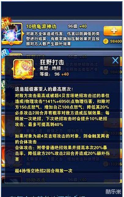 效果评估:超4孙悟空的绝招针对的是敌方最高攻击者目标,会吸取他的怒气并且还会降低他20%的必杀攻击!如果此目标被绝招给套上了压制效果(无法被驱散,会持续到战斗结束),那么就会被限制到绝境,很难再放出必杀技。可以说超4孙悟空的绝招更多的是为了对付敌方极限输出卡片。