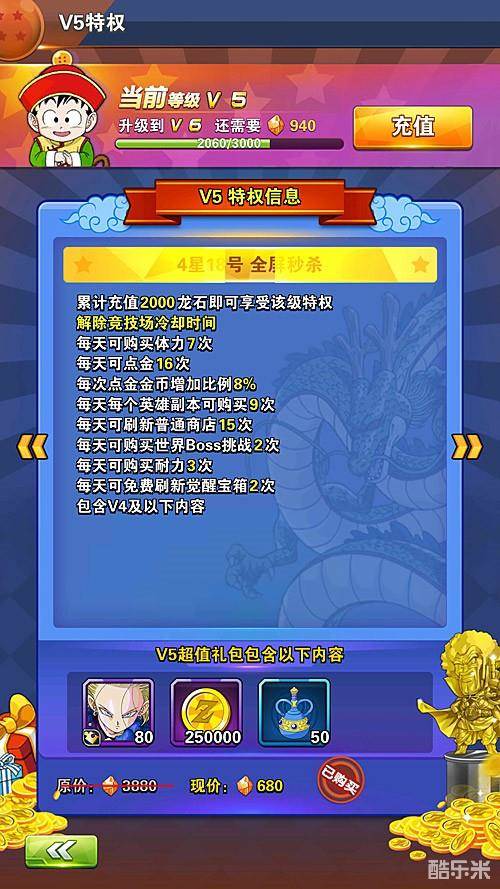 对于一般玩家建议充值到VIP5,不仅可以获得人造人18号碎片,还可以解除竞技场冷却时间,开启高级商店功能,对普通玩家非常有帮助,充值价格为200元还是多数玩家可以接受的。80碎片的人造人碎片弥补了后期培养的疲软。