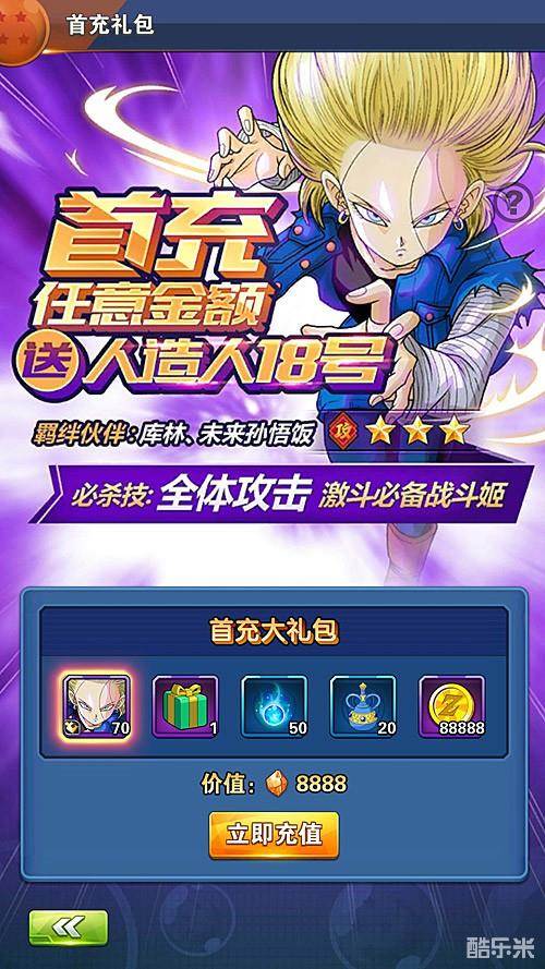 首充的必要性在于人造人十八号。先来看看首充的内容有哪些:人造人18号,礼包,龙魂,圣水,金币。其实要说最受人关注的就是人造人18号了,作为全体输出的攻击型战士,人造人18号在前期可以说是前所未有的强,刷图,竞技,极限挑战和蛇道都是必备。从羁绊上来说,人造人18号的羁绊也是比较容易积累的,前期的龟仙人和库林是新手期就可以获得,未来孙悟饭也可以通过登录7天免费获得。