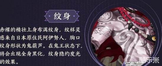 赤裸的精壮上身布满纹身,纹样灵感来自日本原住民阿伊努人,胸口纹身形状为鬼葫芦。在鬼王状态下,将会出现全身黑化,纹身隐约发光的效果。