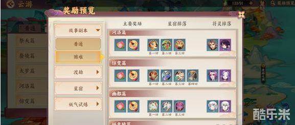 故事副本的选择上首先要保证怪是能一波带走的,以确保带狗粮的效率,其次是看有没有需要的掉落,每个故事副本打完妖界的小boss后都有可能掉落符灵,具体掉落可以在云游右上角奖励处查看.