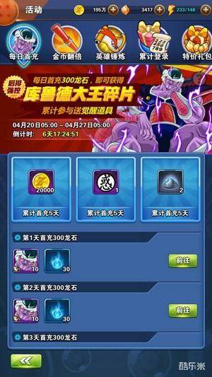 从4月20日-4月27日参与每日首充300龙石获得即可获得不同数量的库鲁德大王的碎片哦。从第一天开始持续每天充值300龙石,到第五天累积充值1500龙石可以获得50库鲁德大王的碎片。由于本次库鲁德大王只有此活动才能获得,所以想要入手的玩家一定要充值呀!