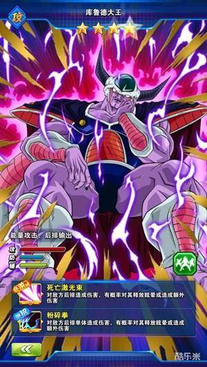 库鲁德大王目前是四星战士,主攻能量攻击和后排输出。跟他的儿子佛利萨不同的是,佛利萨是全体攻击,所以这方面来看貌似不如佛利萨,不过我们可以看打他的技能死亡激光束是可以在后排造成伤害之后额外增加伤害,对比佛利萨的全体伤害来说,重点打击是库鲁德大王的特点。