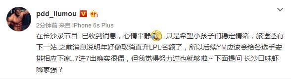 在长沙录节目..已收到消息,心情平静..只是希望小孩子们稳定情绪,旅途还有下一站。之前消息说明年好像取消直升LPL名额了,所以后续YM应该会给各选手安排相应下家..7进7出确实很僵,但我觉得努力过也就够啦~下面提问 长沙口味虾哪家强?