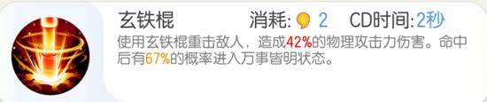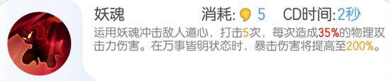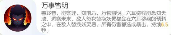 六耳猕猴的2技能妖魂能量消耗高,最好能触发万事皆明再使用,在这之前,可以用1技能玄铁棍自己触发,1次万事皆明基本只能打出1次2技能,我们可以搭配回气速度快的坦克、或者蓄能快速储存能量豆,也可以搭配鹿鸣王,加成自身的物攻; |