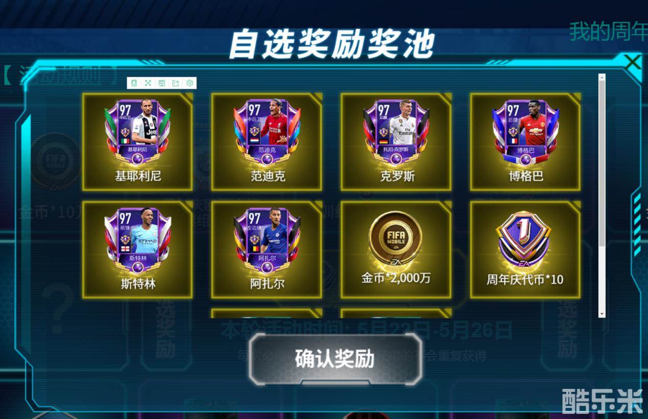 自选奖励奖池内含OVR97周年庆球员以及周年庆代币、突破材料*10等。
