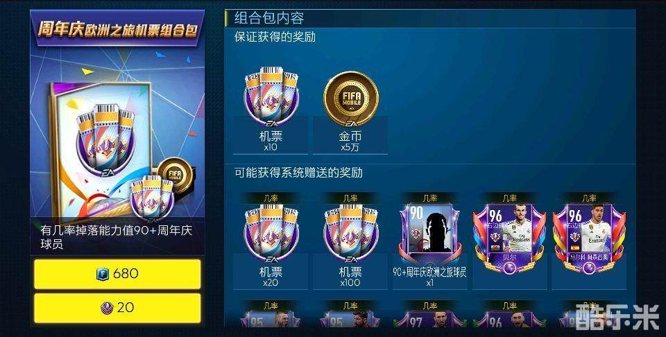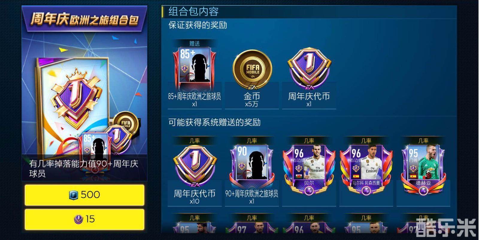 周年庆代币可以用于购买包涵85+球星的欧洲之旅组合包和包涵机票的欧洲之旅机票组合包。