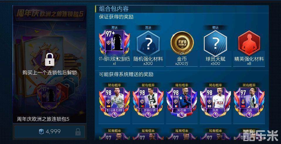 在连锁五,可以获取97+的超级巨星。还有大量的金币,天赋,突破材料作为奖励。超高性价比的连锁礼包不容错过!