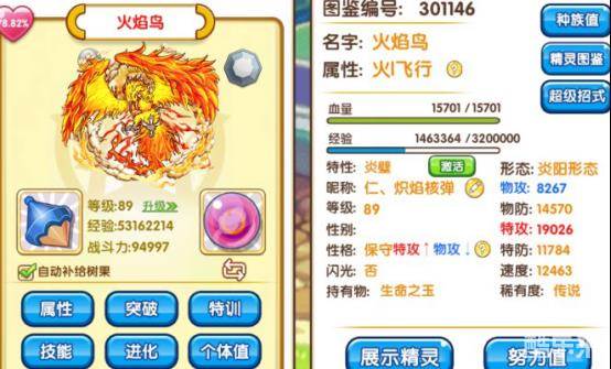 这是目前我的火鸟的面板,亲密度已满,特训50%,徽章为特防+5,这个面板其实已经十分恐怖了,火鸟的特防可能是相对来说比较弱势的一项能力,因此在面对一些特攻手的时候,即使不存在属性克制,也可能会让火鸟受伤惨重,而他的物防能力其实在基本没有加成的情况下,都已经能够达到14300左右的水准(我的面板有255的亲密度),如果不走输出形态,改做物盾吹飞,相信火鸟也能取得不错的效果。而在速度线方面,大家也可以看到,其实没有啥速度加成的火鸟,速度也已经有了12400多,并不算低,而由于和火鸟对线的大多数宠,速度也都在这个水平。对于大多数没有骗术的玩家来说,我更多还是推荐保守血攻的组合,输出就要做到极致,而有骗术的大佬相对来说选择就多一个,冷静血攻也是可以接受的。但是,冷静很可能面临的问题就是在失去了空间手之后,原本保守性格可以卡住同样极限输出的xy,但是冷静就很有可能被卡住速度线,导致被无脑退缩的情况出现。还有一点,有人会说,这不是口袋妖怪加速吗,为什么不推荐加速?恕我直言,性格加速了,你另一项努力加什么。加速度,只有13000的血量你好意思站在场上?加了血量变血速,你输出没有保障又不肉,这就是一个四不像!要么当盾血防,要么极限输出血攻,玩速度火鸟的,火鸟的价值可以说是浪费了不少。