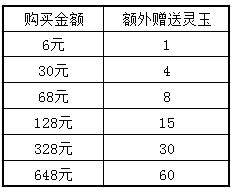 活动内容:活动期间内,玩家购买对应档的灵玉,将会获赠额外的灵玉奖励。每次购买都会获得额外赠送的灵玉。(购买月卡不参加本活动)