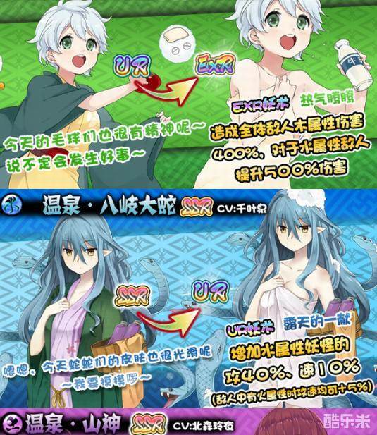 1、活动期间,卡池限时增加 妖异的温泉 主题妖怪 UR「温泉·松明丸」、UR「温泉·雪花娘」、SSR「温泉·八岐大蛇」、SSR「温泉·山神」、SR「温泉·团三郎狸」。