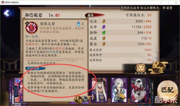 积攒9层buff之后,SP般若就会清除自身所以控制并且自拉条35%。这个意思就是说,就算SP般若被控住了也没关系,满buff之后还是能跑上来。SP般若跑上来之后,就可以花费2点鬼火开启封印结界了。这个封印结界就很有意思了,并不是按照SR般若那样直接使敌方御魂被动失效,而是完全替换掉了敌方所有的被动和御魂。