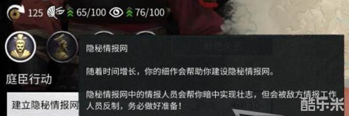 派遣细作之后他们就会在目标派系建立一个新的由联络点、线人和其他隐秘资源组成的隐秘情报网,建立情报网之后会获得情报网点数,由同一派系中的细作共享。