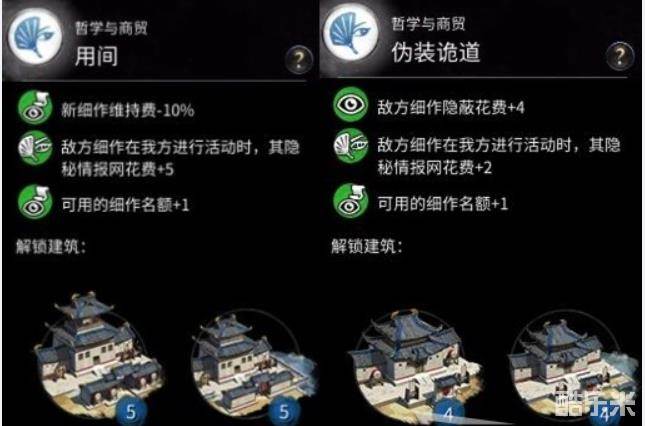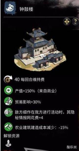 钟鼓楼(需解锁改革【用间】)、派系领袖/丞相/储君、官府官员、辅助设施、某些特定改革以及军师能力/任务等都能增加敌方细作行动的点数消耗。