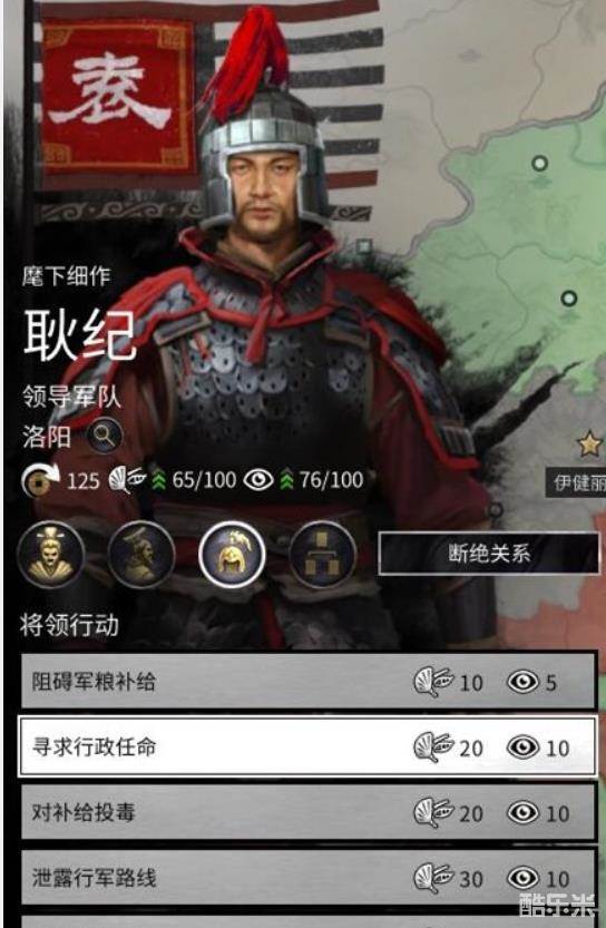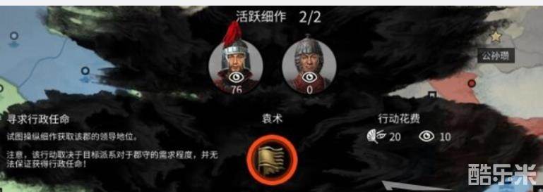 当细作被任命为目标派系的【将领】时,会解锁【将领行动】,包括阻碍军粮补给、寻求行政任命、对补给投毒、泄露行军路线、伪造进军命令、军事策反等。