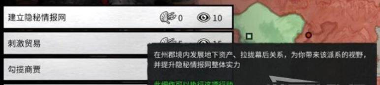 己方派系可通过【增加敌方细作隐蔽花费/隐蔽情报网花费】来增加敌方细作行动的消耗成本,使其细作更难展开行动。