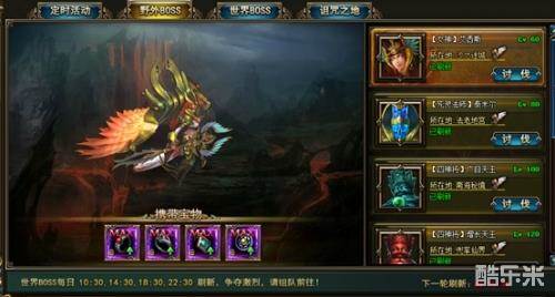 每天定点的10:30、14:30、18:30、22:30玩家可以组队去讨伐也可以让超级玩家带着你打,只要你参与,你就能拿到海量经验和极品装备。这几个BOSS难度不高,不过爆的东西很好。刷新时间都很固定。玩家要把握这个机会,这样才能变强。