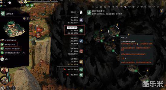 前期是绿色官府支持序列的产粮产量+拓土系列的产粮建筑+黄色的蜀汉税收系列。