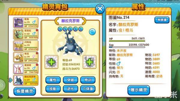 班级拉的招牌技能地震,地上系技能,对虫系只有0.5倍的伤害;山崩地裂,岩石系技能,对虫系也只有0.5倍伤害。反之,虫王的双属性格斗技能,对班级拉有着2倍属性的伤害,众所周知,班级拉弱格斗和水,当mega后的班级拉或特5橙班,美纳斯的一个水炮已经不大可能做到一招秒,样一只虫王或许是一个不错的选择。从上图一只平衡虫王我们可以看出它的物攻和特防都蛮高的,而且速度比班快,先手可以先发致人。