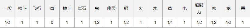 因为虫系加钢系的优势互补使得他的天敌非常少,及除了4倍弱火不被任何属性克制,如下图是各属性技能对巨钳螳螂的效果: