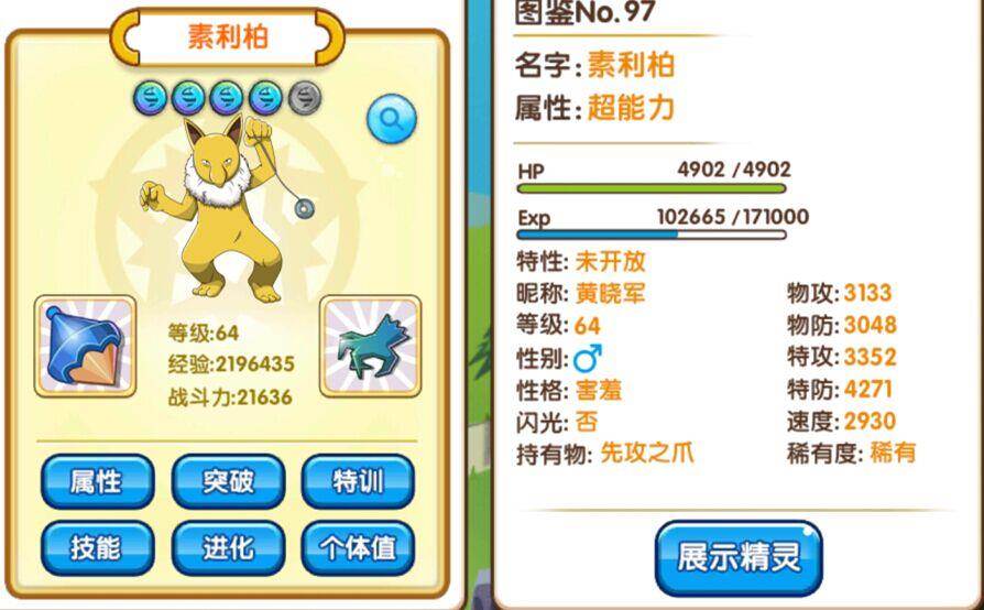 以下是我个人所练的素利拍的一些数据资料。当然个性值方面都培养在30左右。故整体来说不是最完美的状态。