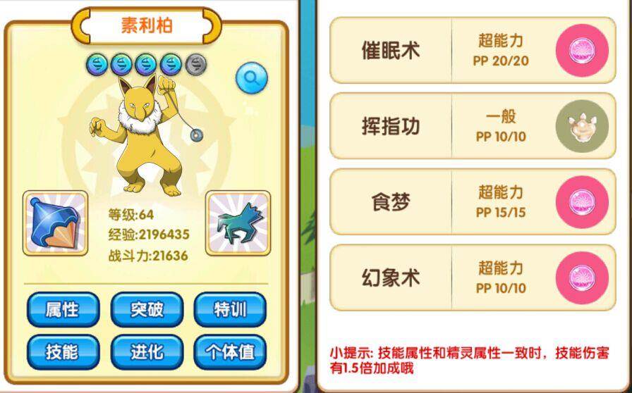 从上图来看的话,素利拍基本上也就特防是稍微高些,但是其他数据不是很能看,但是素利拍最大的利器其实和耿鬼类似,那就是催眠术。下图是我的素利拍技能配置情况。