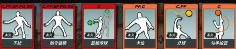 2、卡位(必带):中锋的核心操作,抢篮板必带技能,升级技能可增强身体对抗能力。