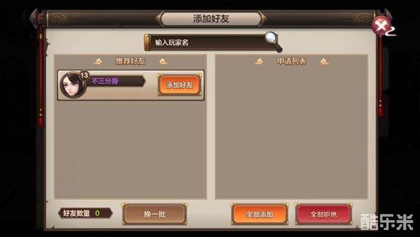 点击好友界面下方添加好友按钮,就可以开始添加/拒绝添加好友。玩家可以选择添加系统推荐好友,或直接输入玩家姓名添加。