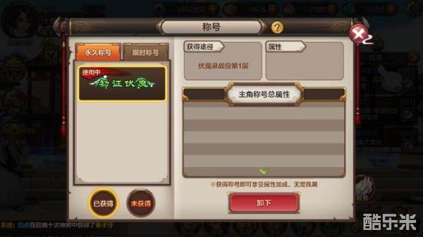 称号分为时限、永久称号两种。获得称号后可以增加人物属性,同时所有已获得称号的属性可叠加。在已获得称号中可选择一个称号进行装备,装备后将显示在人物头顶。