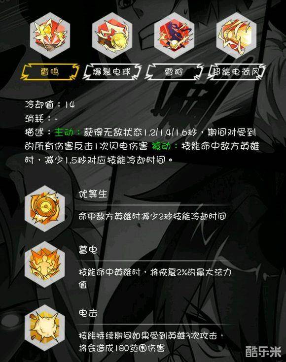 四方里的话我推荐用优等生或者电击,优等生的话,如果团战够激烈,这个无敌技能不断刷新冷却,基本上四五秒就能用一次,很实惠,电击的话就最好就做好死的打算吧,既然能在一点几秒内受到三次伤害,那肯定是一波人围过来了,电击可以在自己劣势的情况下创造一个反杀的机会,善用的话可以反杀对面180血,让队友收割,不过还是得做好牺牲的准备的……