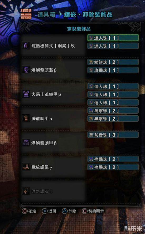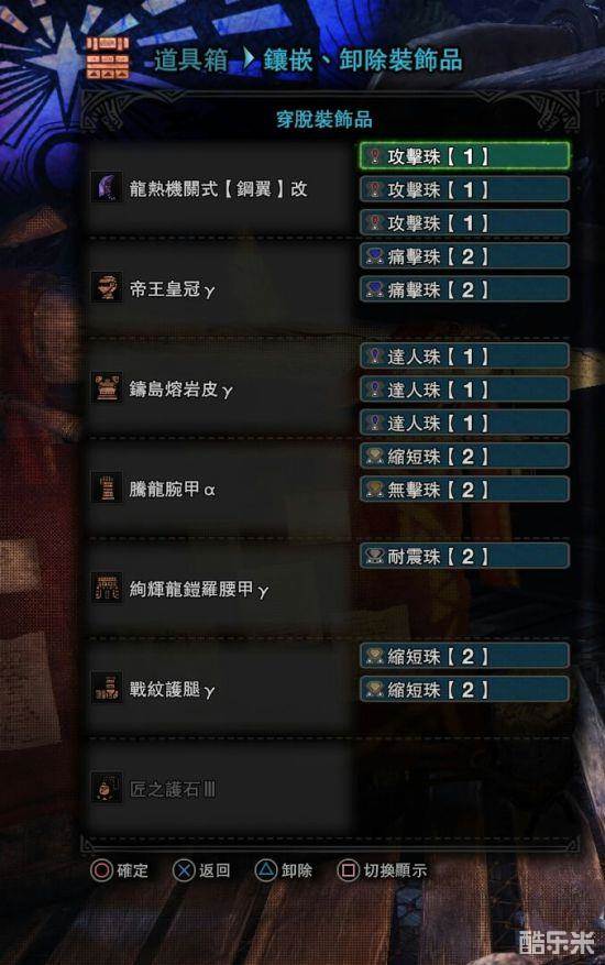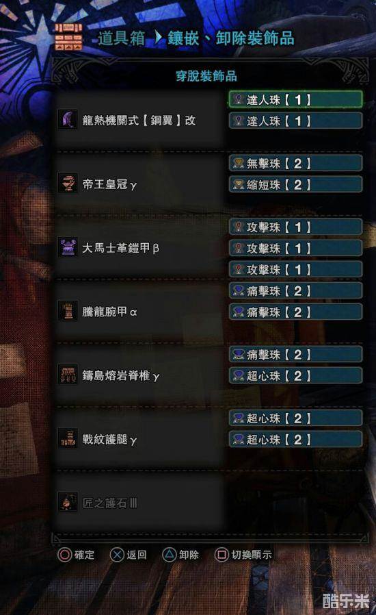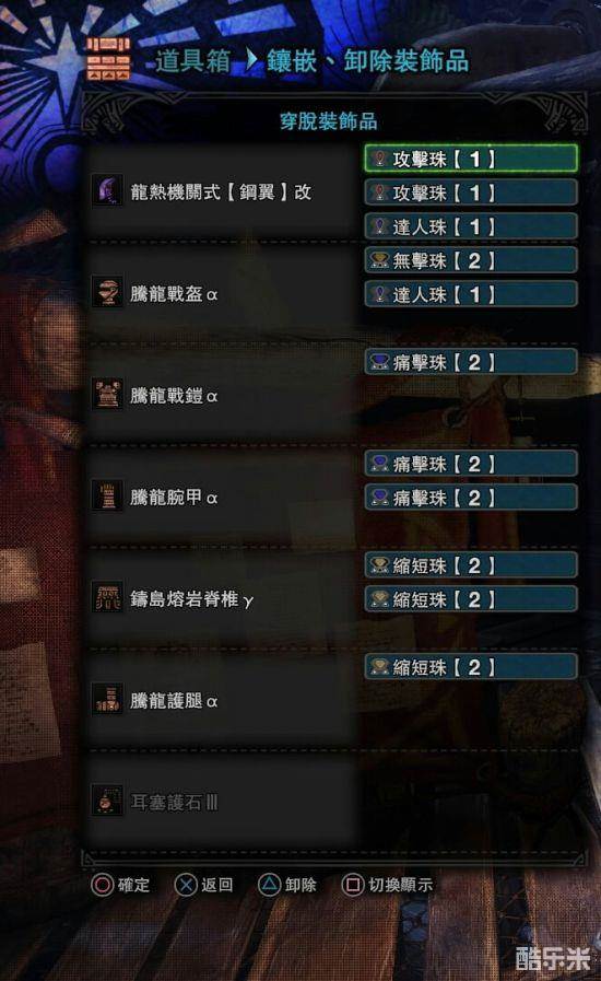 一会一吸,最高会心75,没有达人艺。这套用得很少,主要是考虑到有的怪有一击脱离的情况,精神抖擞起不到效果,所以攻击7。