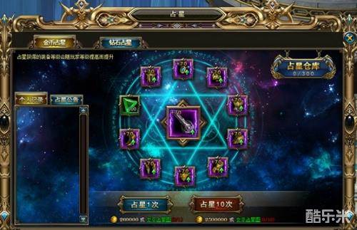 点击占星按钮可进入占星系统。玩家在占星界面内可花费一定数量的金币或钻石来寻获物品,占星可分为金币占星和钻石占星两种,有众多豪礼等着玩家寻获。为了保证各道具的新鲜感,我们会不定期的更新占星物品,如果你有心怡的宝物,千万不要犹豫了,不然错过了下次出现就不知道什么时候了。
