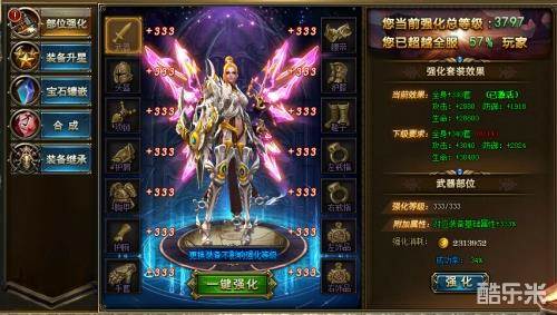 装备强化特色:诸神黄昏中的强化系统强化的是装备部位,这样玩家同一个部位的装备只需要强化一次就可以永久生效,玩家再也不用担心更换装备后的装备强化消耗了。