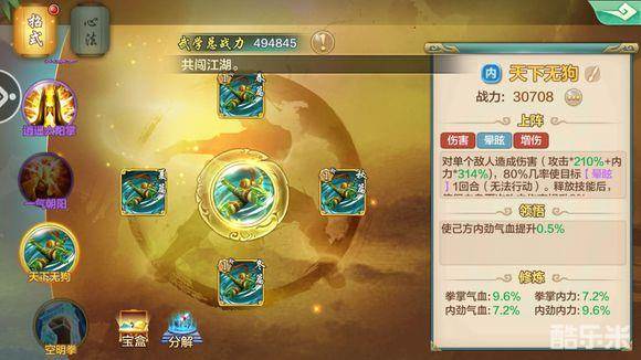 紫品招式---天下无狗:1、系统介绍标有“内”字,提示适合给内劲类侠客用,因为期效果中加攻击的百分比,内力的加层相对教高,而一般内劲侠客的内力提升的数据相对其他系别的侠客要高一些,当然前天的话,这样的招式也可以给自己的头号打手侠客去秒对方的脆皮;2、效果:伤害+晕眩+增伤,对单个敌人造成伤害(攻击*210%+内力*314%),80%的几率使目标晕眩1回合无法行动。释放技能后,使得自身下次攻击伤害提升8%;3、领悟:使自己内劲气血提升0.5%;4、修炼:拳掌气血---9.6%、拳掌内力---7.2%、内劲气血---7.2%、内劲内力---9.6%。可以看出品级越高加的相应的数据也越多。